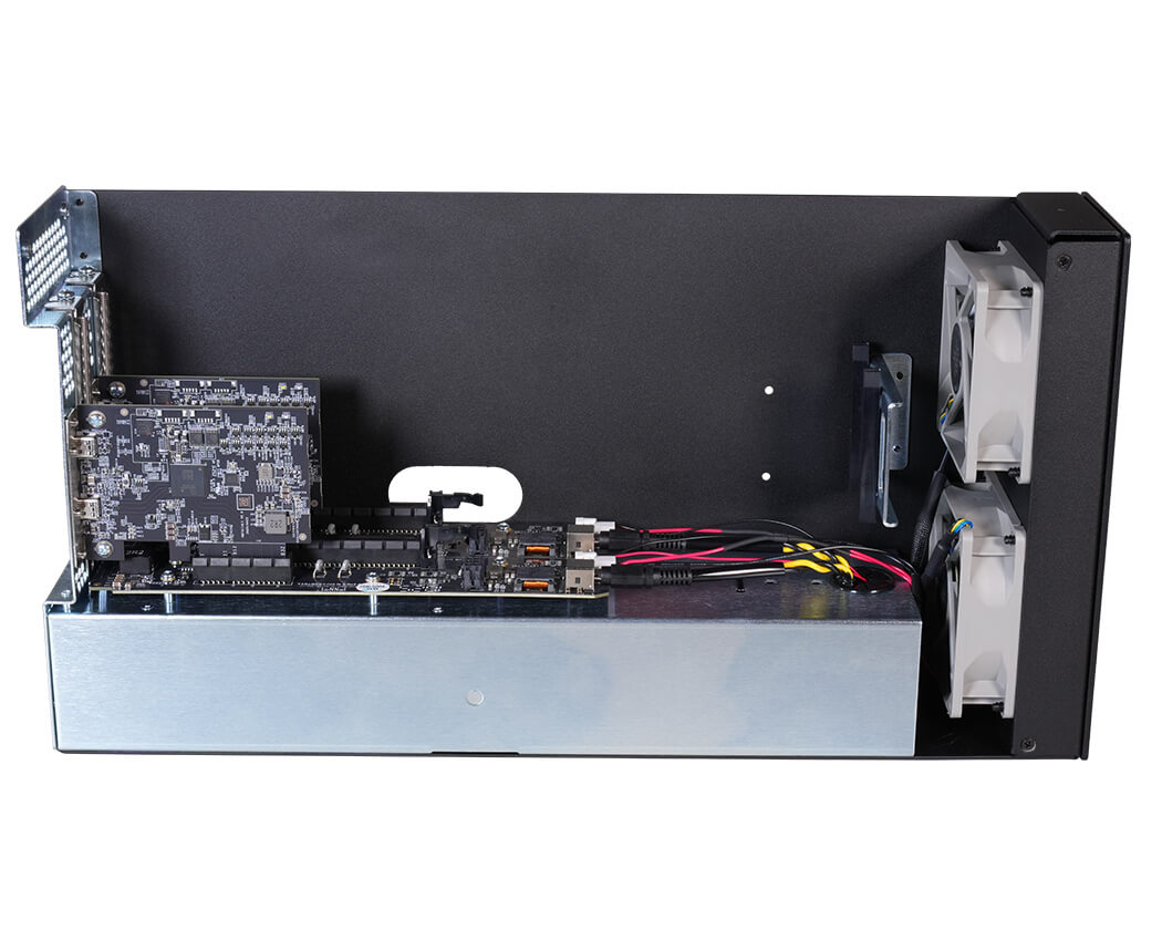 Systemet gør det muligt at tilslutte to højtydende PCIe-kort og give hvert kort sin egen dedikerede Thunderbolt 5-forbindelse, så båndbredden ikke deles.