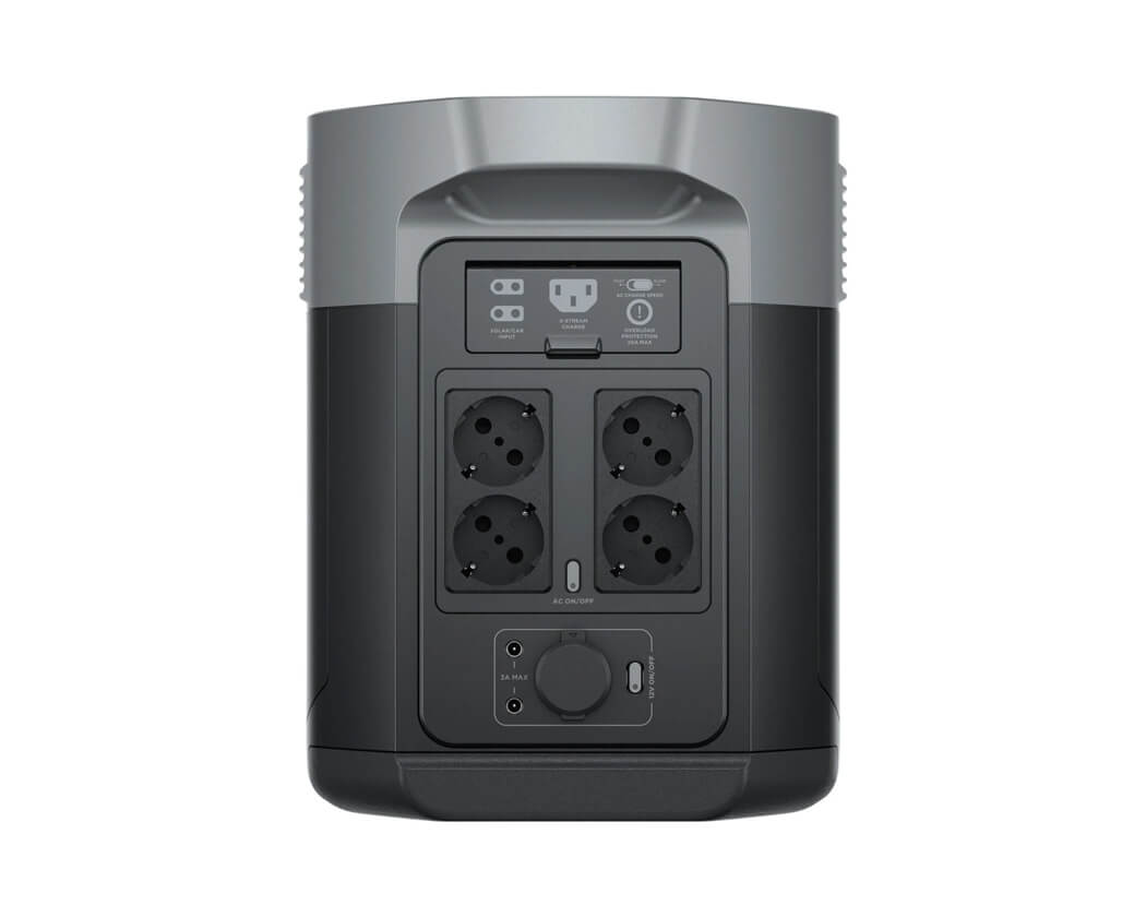 Strømstationen har flere udgangstyper, herunder AC-udtag, USB-A, USB-C og DC-udgange. Det gør det muligt at forsyne flere enheder samtidig uden ekstra strømfordelere.