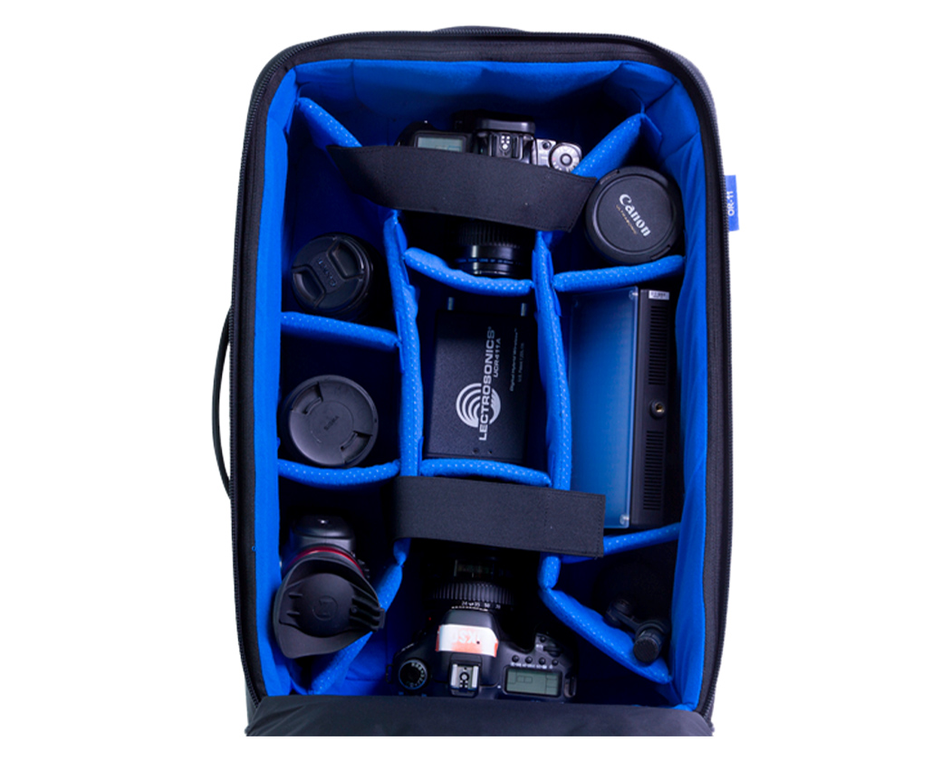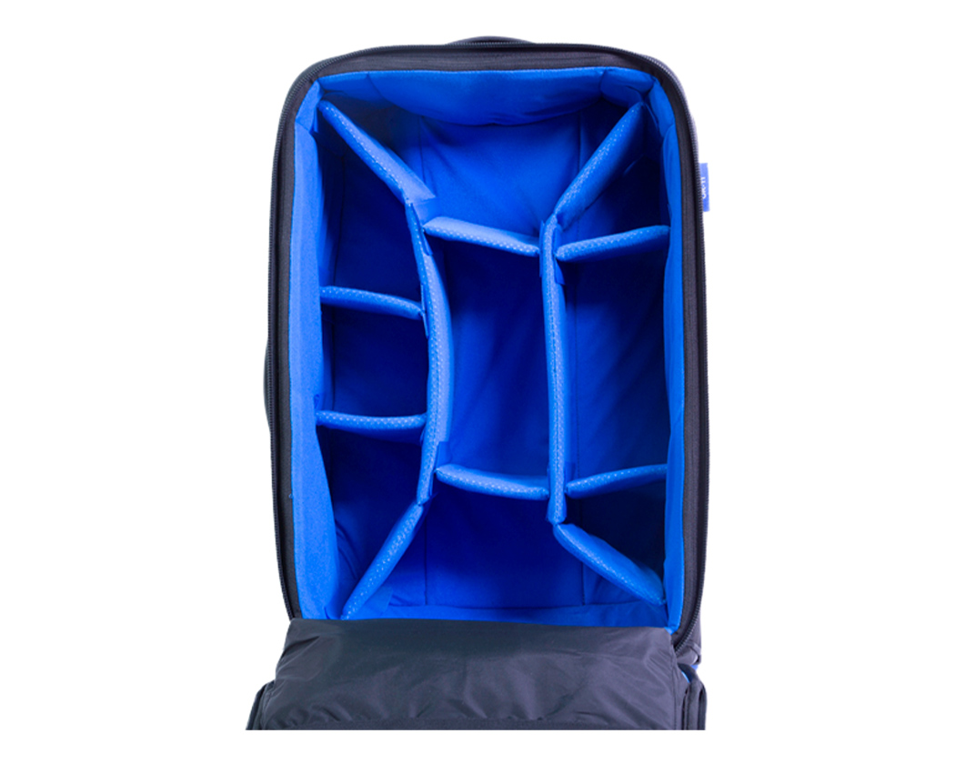 Tasken er udstyret med hjul og teleskophåndtag, så den kan rulles gennem lufthavne, studier og locations uden at skulle bæres. I låget findes der samtidig et separat rum til laptop på op til 17", så både computer og kameragear kan transporteres i samme taske.